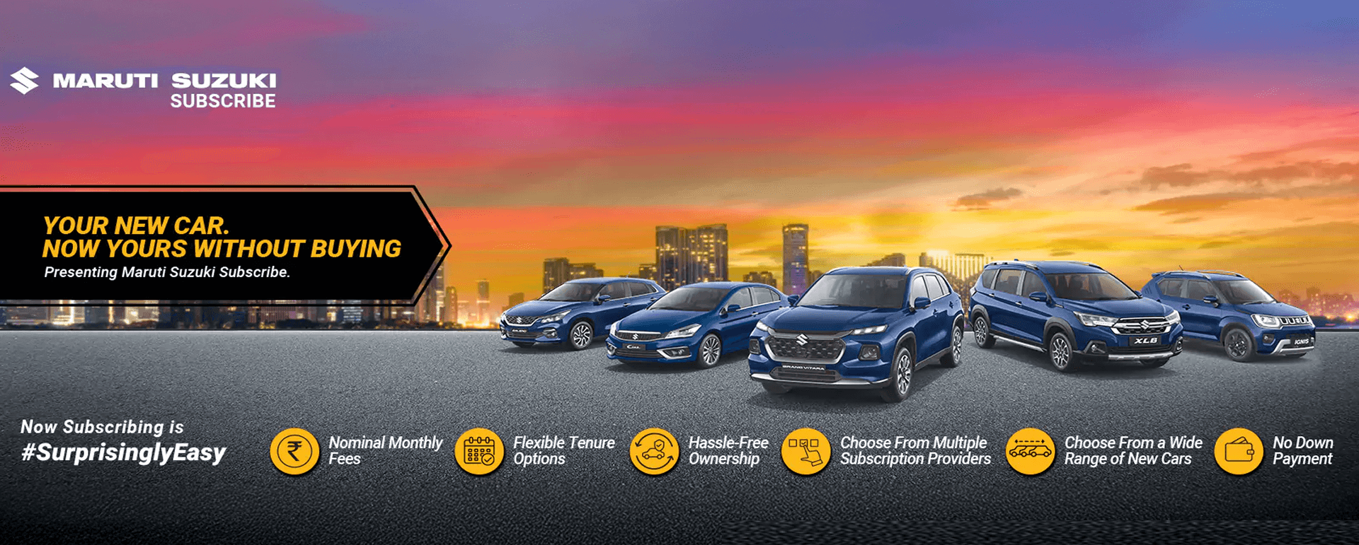 Maruti Suzuki Subscribe enables all customers to enjoy driving their preferred Maruti Suzuki cars without having to deal with all the financial responsibilities that come with owning a car. All you need to do is opt for a monthly subscription plan at a fixed monthly fee, which includes the routine maintenance and insurance costs, and choose a flexible tenure. At Saboo RKS Motors in, Kushaiguda, Hyderabad, all Hatchback, Sedan, SUV, the MUV models line-up includes Alto K10, Celerio, Dzire, Eeco, Ertiga, Swift, S-Presso, Brezza, Victoris, WagonR. Here, you will enjoy Maruti Suzuki Subscribe benefits such as:
